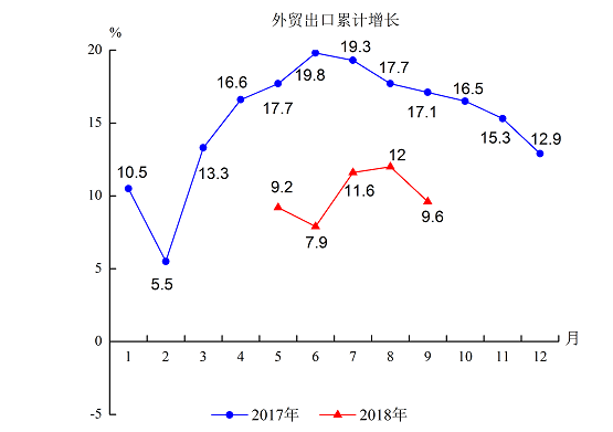11.1-9月外貿(mào)出口140.68億元,增長9.6%,增幅比去年同期回落7.5個百分點。