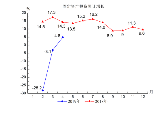 2.固定資產投資額增長4.8%,增幅比上年同期回落9.5個百分點。