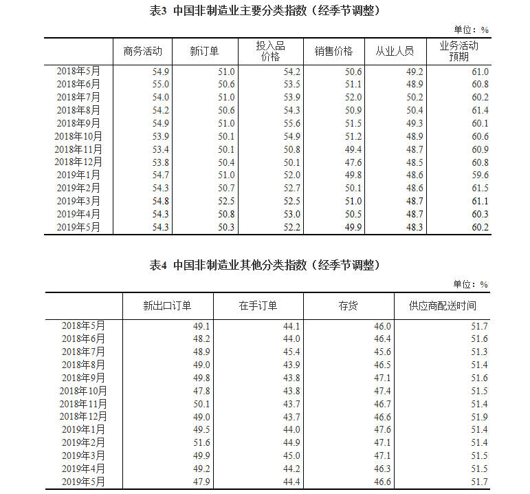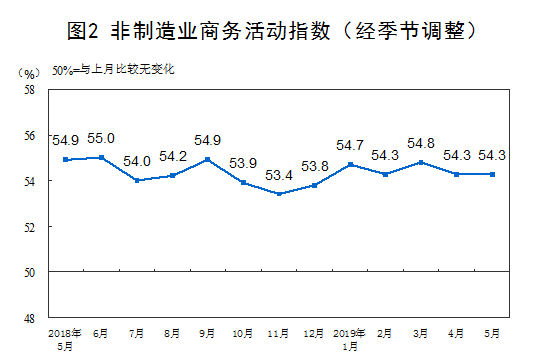 2019年5月份,中國非制造業商務活動指數為54.3%,與上月持平,表明非制造業總體延續平穩較快的發展勢頭。