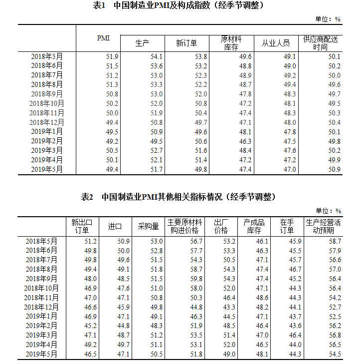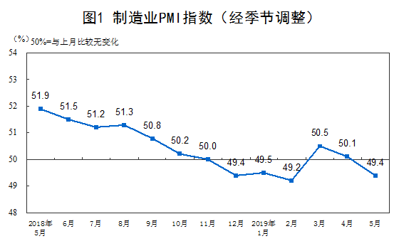 2019年5月份,中國制造業采購經理指數(PMI)為49.4%,比上月回落0.7個百分點。