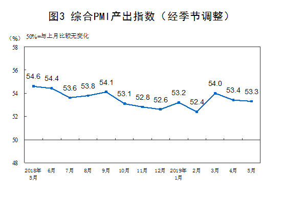 2019年5月份,綜合PMI產出指數為53.3%,比上月微落0.1個百分點,表明我國企業生產經營活動總體保持平穩發展態勢。