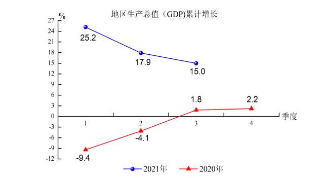 1.據市統計局初步核定,全縣GDP 524.8億元,同比增長15%,比2019年前三季度增長17%,兩年平均增長8.2%,比上半年兩年平均增速提高1.9個百分點。