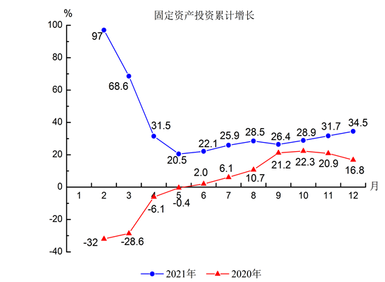 4.固定資產投資額同比增長34.5%,比2019年增長57.1%,兩年平均增長25.3%。