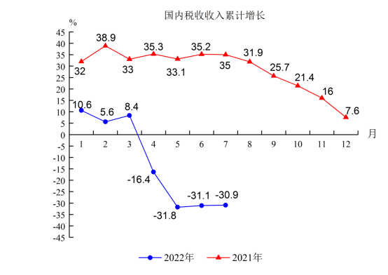 備注:圖中稅收收入累計(jì)增速為自然口徑增速;按增值稅留抵退稅還原口徑計(jì)算,1-7月稅收收入累計(jì)下降6.8%。