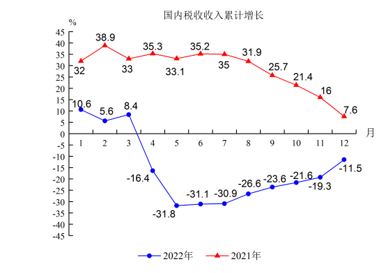 備注:圖中稅收收入累計增速為自然口徑增速;按增值稅留抵退稅還原口徑計算,1-12月稅收收入累計增長2.3%。
