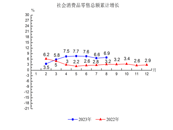 3.社會消費品零售總額230.67億元,增長6.9%,比1-7月提高0.3個百分點,總量、增速均居第3位。