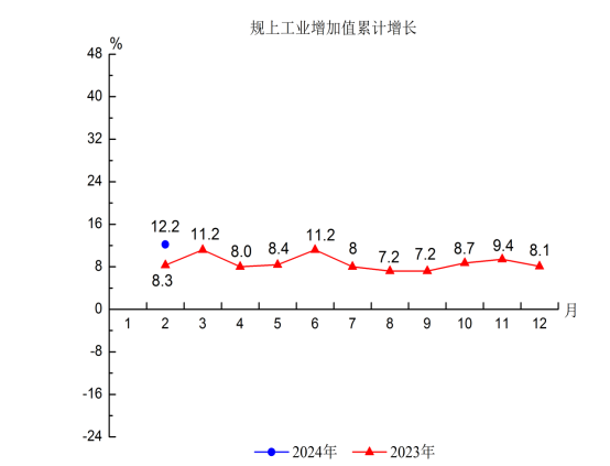 1.工業生產企穩回升,重點行業支撐作用明顯。1-2月全縣規上工業總產值增長8.6%,比2023年全年提高2.4個百分點;規上工業增加值增長12.2%,比2023年全年提高4.1個百分點。超6成行業保持增長。全縣33個工業行業大類中有21個行業產值同比實現正增長,行業增長面達63.6%。重點行業支撐作用明顯。1-2月全縣前5大行業合計完成產值增長15.2%,增速高于全縣平均水平6.6個百分點,拉動全縣規上工業總產值增長8.1個百分點。