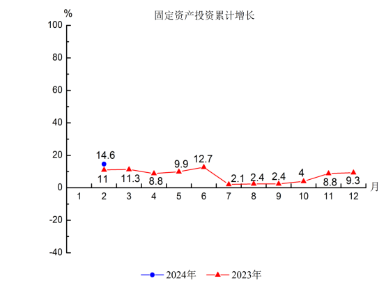 2.有效投資穩中有進,工業項目建設持續加碼。全縣堅持抓項目建設擴有效投資,有力釋放經濟增長潛力。1-2月全縣固定資產投資額增長14.6%,高于全市平均水平(3%)11.6個百分點。房地產開發投資實現近兩年首次正增長。1-2月全縣項目投資增長19.2%;房地產開發投資增長2.9%,自2022年以來首次實現正增長。工業投資項目規模持續擴大。1-2月全縣工業投資增長22.5%,占全縣固定資產投資49.5%,占比同比提高3.2個百分點。1-2月全縣基礎設施投資增長9.6%;建安投資增長6%。億元以上項目完成投資增長較快。1-2月全縣億元以上投資項目(不含房地產開發)本年完成投資增長22%,高于全縣固定資產投資增速7.4個百分點。