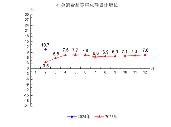 3.消費市場回暖向好,限上社會消費品零售總額占比提高。1-2月全縣社會消費品零售總額62.72億元,增長10.7%,同比提高7.2個百分點。分限上限下看,限上社會消費品零售總額11.05億元,增長45.1%,增速高于全市平均水平26.9個百分點,占全縣社會消費品零售總額比重達17.6%,比重同比提高3.9個百分點;限下社會消費品零售總額51.67億元,增長5.3%。限上零售業銷售額保持快增。1-2月全縣限上零售業完成銷售額4.73億元,增長114.6%,增速比2023年全年提高52.9個百分點。限上批發業完成銷售額11.32億元,下降28.7%;限上住宿、餐飲業分別完成營業額0.49億元、0.95億元,分別增長11%、66.3%。