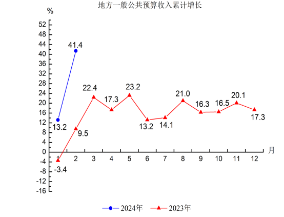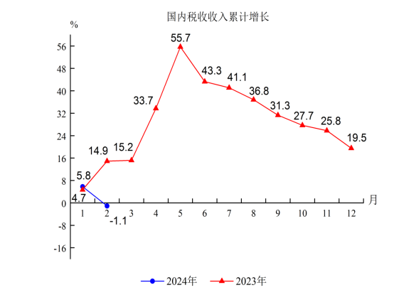 5.財政收入保持快增,稅收收入有所回落。1-2月全縣一般公共預算收入15.09億元,增長41.4%,自2021年5月以來首次實現40%以上增長。從收入構成看,稅收收入6.97億元,下降7.8%;非稅收入8.12億元,增長160.4%,增速同比提高168.5個百分點。1-2月全縣國內稅收收入22.63億元,下降1.1%;其中,國內增值稅15.61億元,增長8.4%。