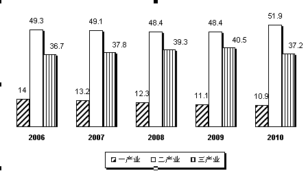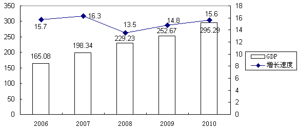 初步統計,2010年全縣實現地區生產總值295.29億元,比去年同期增長(以下簡稱增長)15.6%。其中第一產業增加值32.3億元,增長6.5%;第二產業增加值153.29億元,增長25.1%;第三產業增加值109.7億元,增長6.2%。三大產業結構由上年的11.1:48.4:40.5調整為10.9:51.9:37.2。人均生產總值達30602元(預計),增長14.7%。