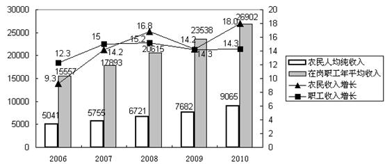 表12:2006-2010年農民人均純收入和在崗職工年平均收入及增幅