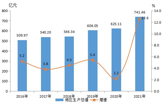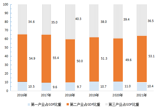 據市統計局初步核算,2021年全縣地區生產總值(GDP)741.46億元,按可比價格計算,比上年增長(以下簡稱增長) 12.6%。其中,第一、第二、第三產業分別實現增加值76.74億元、393.99億元和270.73億元,分別增長12.7%、17.4%和6.6%,三次產業結構為10.4:53.1:36.5。2021年GDP比2016年增長31.5%,2017-2021年年均增長5.6%。2016-2021年GDP及增速情況見圖1,三大產業結構變化見圖2。