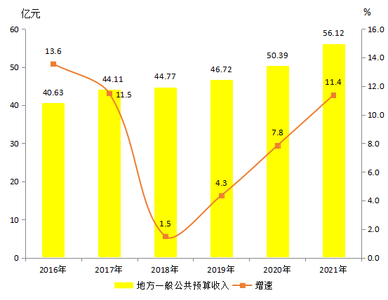 全年地方一般公共預算收入56.12億元,增長11.4%;比2016年增加15.48億元,比2016年增長41.8%,2017-2021年年均增長7.2%。2016-2021年全縣地方一般公共預算收入情況見圖3。2021年,地方一般公共預算收入中稅收收入40.76億元,增長9.4%;占一般公共預算收入的72.6%,比重比上年下降1.3個百分點,比2016年提高15.3個百分點,2017-2021年年均提高3.06個百分點。