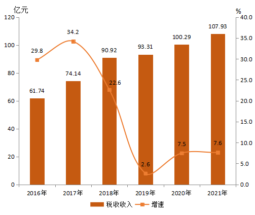 全縣完成總稅收107.93億元,增長7.6%;比2016年增加46.19億元,比2016年增長95.3%,2017-2021年年均增長14.3%。2016-2021年稅收收入情況見圖5。2021年,稅收收入中,國內增值稅48.58億元,下降9 %,占稅收收入的45%;企業所得稅25.26億元,增長53.4%,占稅收收入的23.4%;個人所得稅5.08億元,增長0.6%,占稅收收入的4.7%。