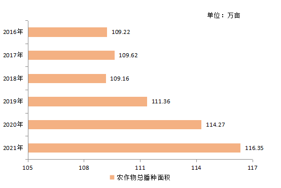 全縣農作物總播種面積116.35萬畝,比上年增加2.08萬畝,增長1.8%;比2016年增加7.13萬畝。2016-2021年農作物總播種面積見圖6。全年谷物播種面積41.17萬畝,比上年減少0.05萬畝,下降0.1%;油料作物播種面積9.14萬畝,比上年減少0.25萬畝,下降2.7%;蔬菜播種面積59.84萬畝,比上年增加2.1萬畝,增長3.6%。