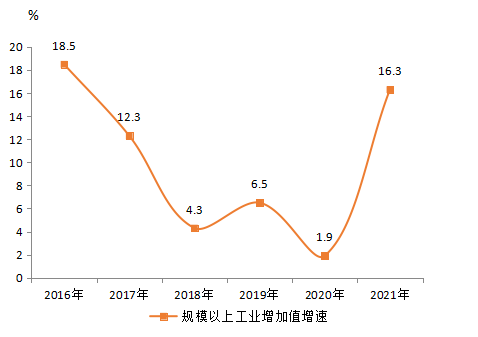 2021年全縣規模以上工業增加值增長16.3%。2016-2021年規模以上工業增加值增速見圖7。