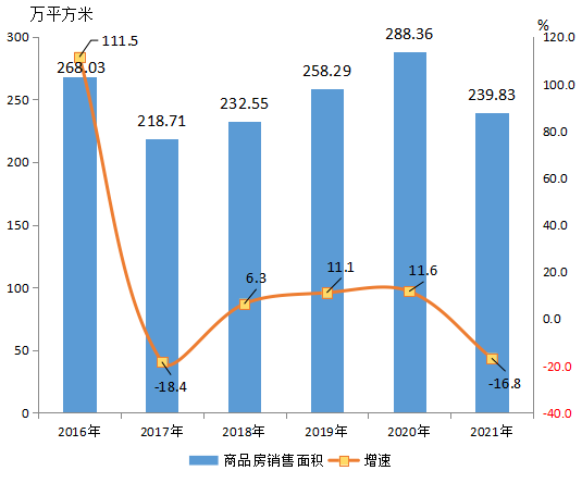 全年商品房銷售面積239.83萬平方米,下降16.8%;比2016年減少28.2萬平方米,下降10.5%,2017-2021年年均下降2.2%(見圖9)。商品房銷售額210.52億元,下降16.4%。