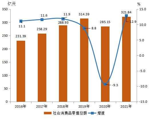 全年社會消費品零售總額321.84億元,增長12.9%;比2016年增加90.44億元,增長39.1%,2017-2021年年均增長6.8%(見圖10)。分限上限下看,限上消費品零售總額41.54億元,增長16.8%;限下消費品零售總額280.29億元,增長12.3%。限上網報單位中,批發業、零售業、住宿業、餐飲業分別實現零售額0.97億元、10.17億元、0.38億元和2.46億元,分別下降9.3%、增長17.2%、13.1%和0.1%。從經營形態看,批發業商品銷售額187.99億元,增長62.4%;零售業商品銷售額163.84億元,增長17.8%;住宿業營業額2.53億元,增長14.4%;餐飲業營業額33.81億元,增長15.4%。