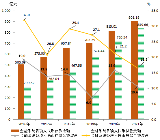 金融業穩步發展。截至2021年末,全縣共有銀行業金融機構14家,全縣金融機構各項人民幣存款余額901.19億元,增長10.6%;比2016年末增加396.1億元,增長78.4%,2017-2021年年均增長12.3%。其中,儲蓄存款余額574.44億元,增長11.4%;住戶存款余額559.63億元,增長11.5%。金融機構各項人民幣貸款余額839.66億元,增長16.5%;比2016年末增加539.84億元,增長180%,2017-2021年年均增長22.9%。其中,住戶和非金融企業及機關團體貸款中,短期貸款70.3億元,下降23.6%,占8.4%;中長期貸款756.37億元,增長21.3%,占90.1%。全年實現金融業增加值30.37億元,增長2.3%。2016-2021年金融機構人民幣存貸款余額及增速見圖11。