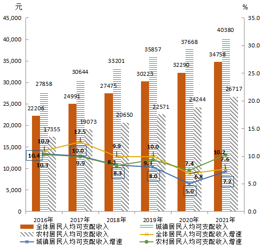 據國家統計局博羅調查隊統計,全年全縣居民人均可支配收入34758元,增長7.6%,剔除價格因素,實際增長6%;比2016年增加12552元,增長56.5%,2017-2021年年均增長9.4%。其中,城鎮居民人均可支配收入40380元,增長7.2%,剔除價格因素,實際增長5.6%;比2016年增加12523元,增長45%,2017-2021年年均增長7.7%。農村居民人均可支配收入26717元,增長10.2%,剔除價格因素,實際增長8.5%;比2016年增加9362元,增長53.9%,2017-2021年年均增長9%。2016-2021年居民人均可支配收入及增速見圖12。