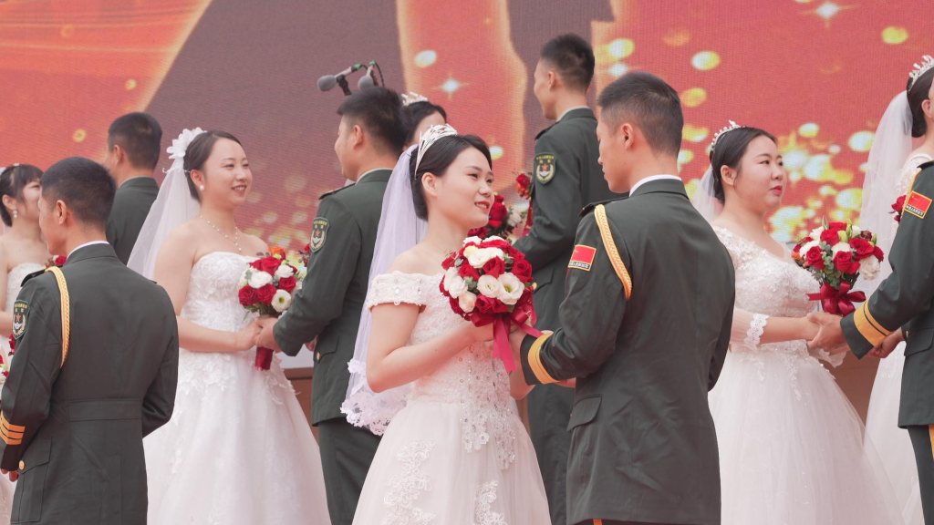 伴著悠揚浪漫的樂曲聲,新娘們手捧花束,和新郎攜手步入紅毯、走向舞臺。在藍天白云下,忠誠與浪漫交融、信仰與誓言相伴,30對新人在部隊領導和戰友親屬的共同見證下,喜結連理、白首成約。