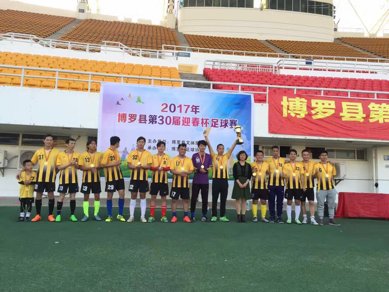 2017年元月14日-22日由博羅縣文體旅游局主辦,縣足球協會承辦的2017年博羅縣第30屆迎春杯足球賽在博羅縣體育中心體育場隆重舉行。比賽設立男子公開組,來自全縣的12支球隊,共二百多名運動員參加了比賽。 經過九天的激烈鏖戰,2017年博羅縣第30屆迎春杯足球賽終于落下帷幕,最終博羅開電氣隊獲得本次比賽桂冠;恒遠隊、亮劍隊獲得第二、第三名;博翼隊、東裕隊、博青隊獲得四至六名,博翼隊獲得比賽優秀組織獎。