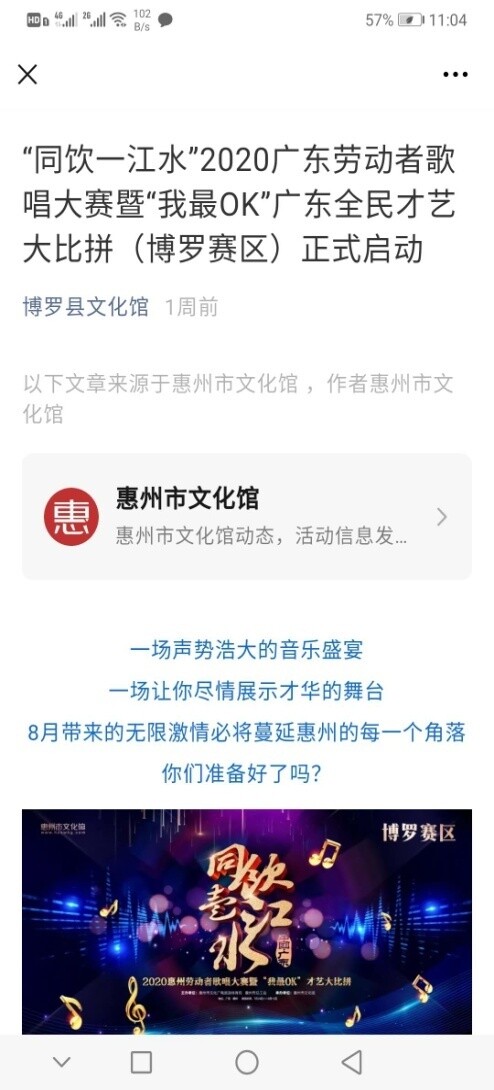 8月2日-8月12日,“同飲一江水”2020廣東勞動者歌唱大賽暨“我最OK”廣東才藝大比拼,博羅賽區選拔賽在博羅縣文化館公眾微信平臺進行,目前共有10多位選手參與報名,15日進行網絡評選。