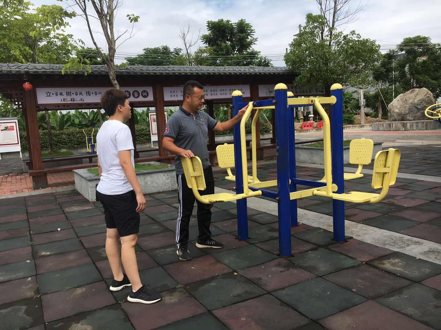 9月14日,博羅縣文廣旅體局工作人員前往長寧鎮新江村新時代文明實踐站檢查全民健身器材情況。