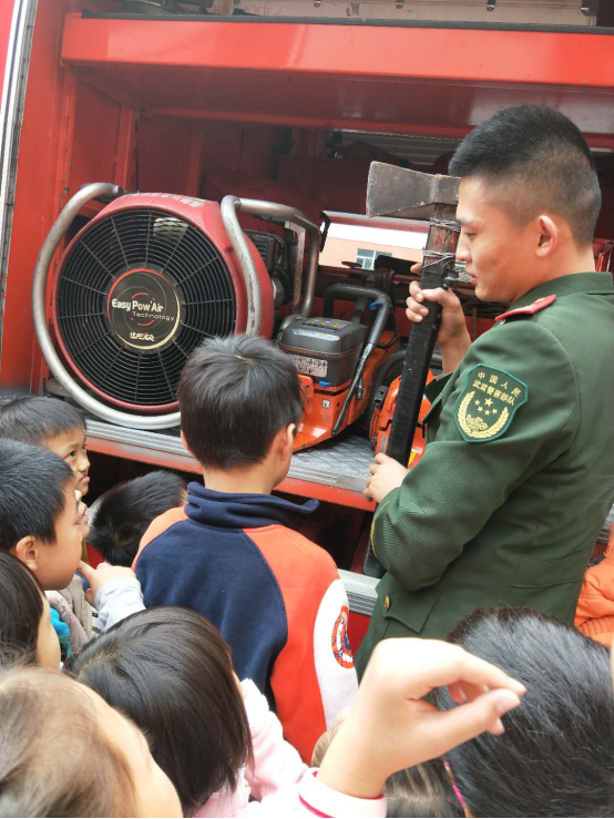 接著消防官兵代表向家長(zhǎng)和兒童們介紹消防衣的穿著和消防員進(jìn)入火場(chǎng)時(shí)的標(biāo)準(zhǔn)裝備,又向幼兒講解在車(chē)禍及一些救助現(xiàn)場(chǎng),應(yīng)該準(zhǔn)備的各種裝備和每輛消防車(chē)輛的功能。孩子們在參觀的過(guò)程中爭(zhēng)先恐后地嘗試穿消防服,調(diào)高壓水槍,上消防車(chē)等技能。每個(gè)孩子的臉上都洋溢著自豪和滿(mǎn)足的笑容。