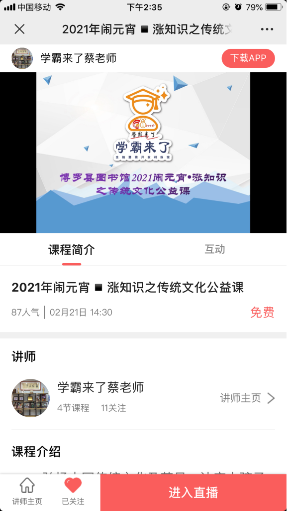2月21日,為弘揚(yáng)中國傳統(tǒng)文化及節(jié)日相關(guān)知識,讓廣大市民了解更多關(guān)于元宵的風(fēng)俗文化,博羅縣圖書館聯(lián)合相關(guān)培訓(xùn)機(jī)構(gòu)舉辦“鬧元宵·漲知識之傳統(tǒng)文化”線上公益分享課。