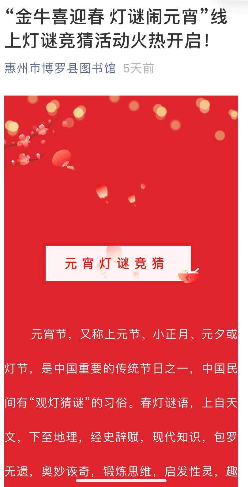 2月25日至2月26日,博羅縣圖書館與惠州市其他公共圖書館聯(lián)合推出“金牛喜迎春 燈謎鬧元宵”聯(lián)動(dòng)燈謎競猜線上活動(dòng)。