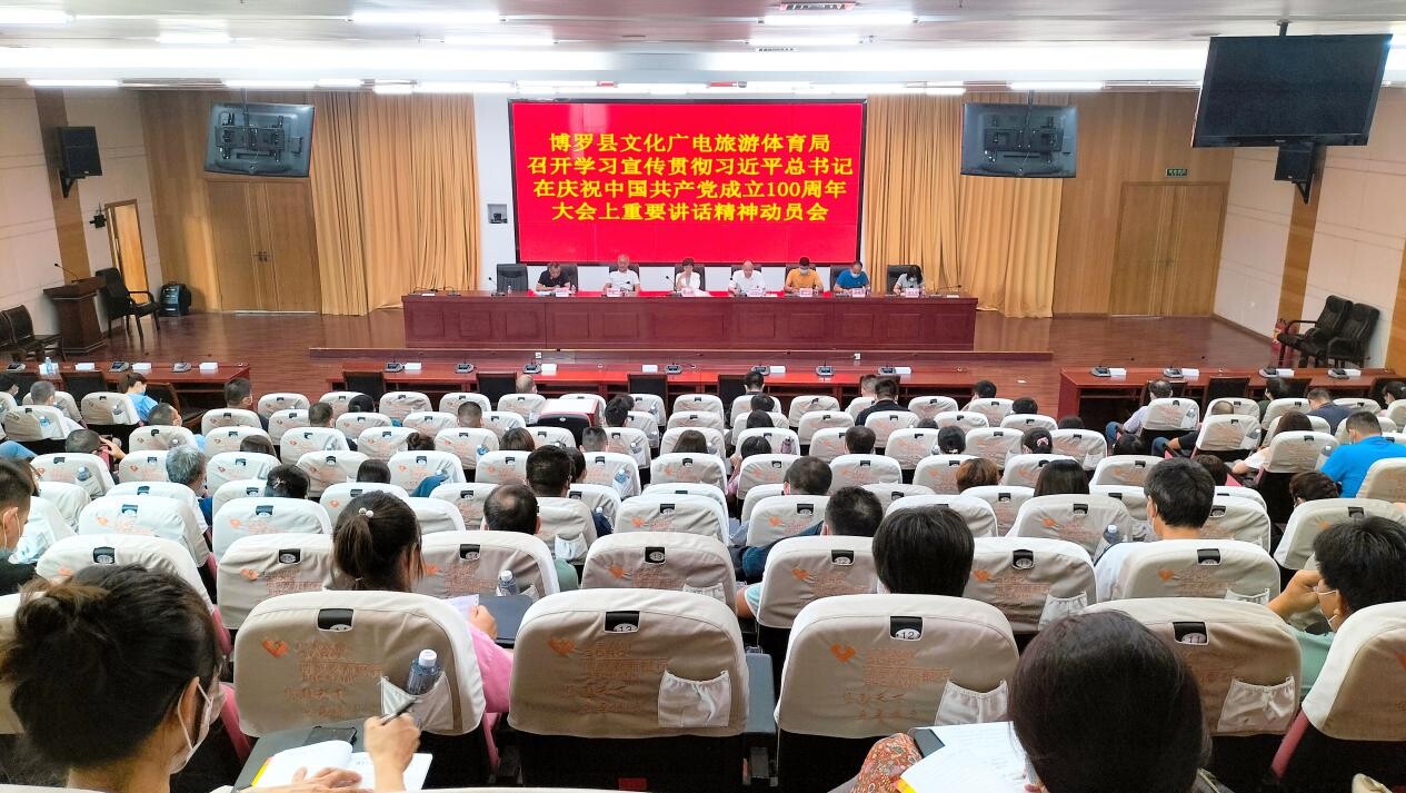 2021年7月9日下午,博羅縣文化廣電旅游體育局召開(kāi)學(xué)習(xí)貫徹習(xí)近平總書(shū)記在慶祝中國(guó)共產(chǎn)黨成立100周年大會(huì)上的重要講話精神動(dòng)員會(huì)。會(huì)議傳達(dá)學(xué)習(xí)了習(xí)近平總書(shū)記在慶祝中國(guó)共產(chǎn)黨成立100周年大會(huì)上的重要講話精神和省、市、縣學(xué)習(xí)貫徹習(xí)近平總書(shū)記在慶祝中國(guó)共產(chǎn)黨成立100周年大會(huì)上的重要講話學(xué)習(xí)會(huì)議精神,并對(duì)我局學(xué)習(xí)宣傳貫徹工作進(jìn)行全面部署。全局約150人參加會(huì)議,局黨組書(shū)記、局長(zhǎng)陳雪花作動(dòng)員講話。