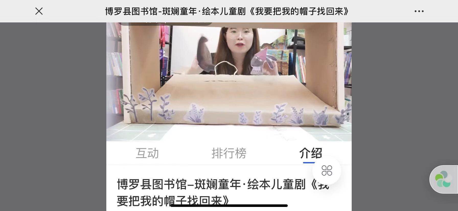 9月5日,縣圖書館聯合相關機構舉辦線上“斑斕童年·繪本兒童劇”——《我要把我的帽子找回來》,老師用紙偶場景劇的藝術形式向小朋友們傳遞了繪本故事中的內涵,活動共有289人參與。