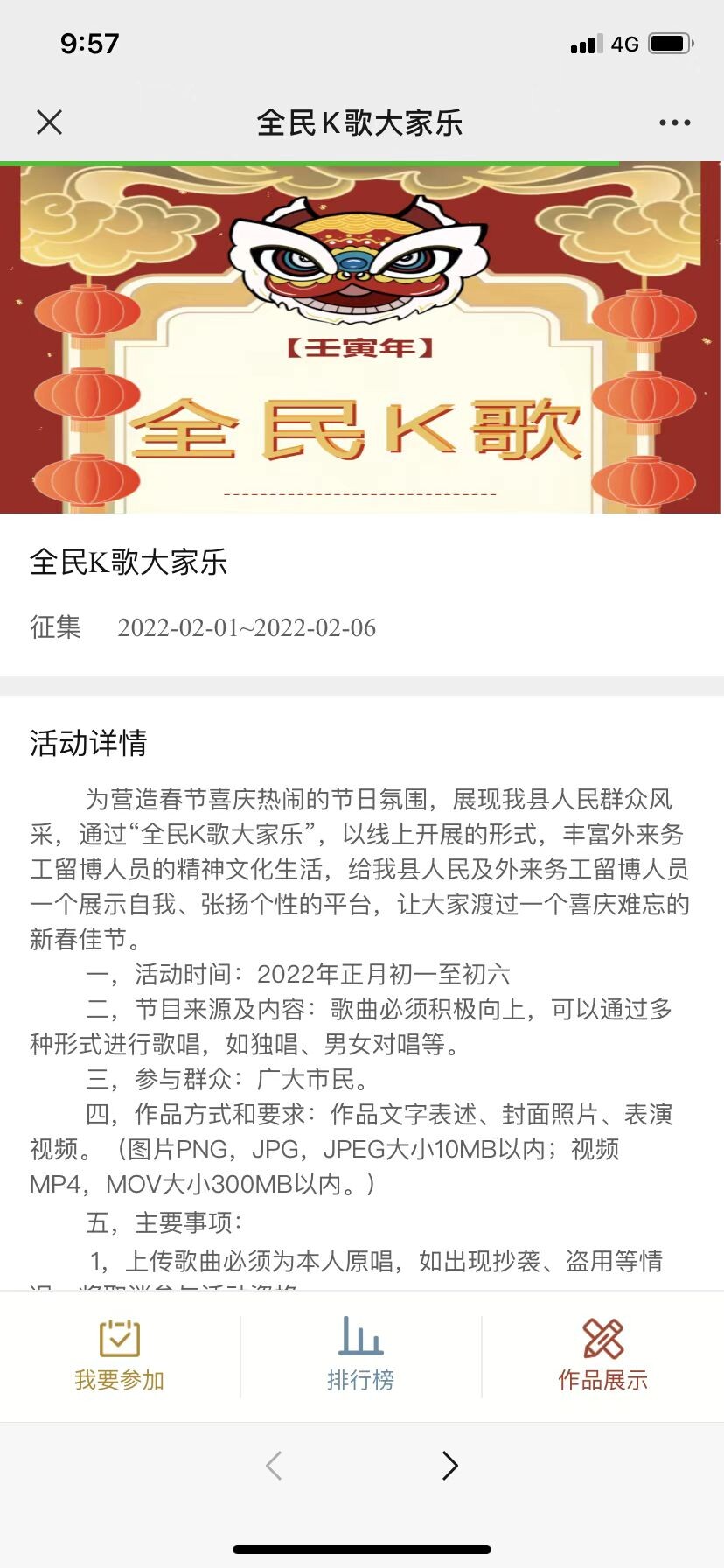 春節期間,正月初一至初六縣文化館攜手超星集團舉辦全民K歌大家樂活動,鼓勵廣大群眾用最獨一無二的聲音,將新年的祝福記錄下來,在寒冷的冬日,送上“聲聲”祝福,傳遞溫暖與真情。