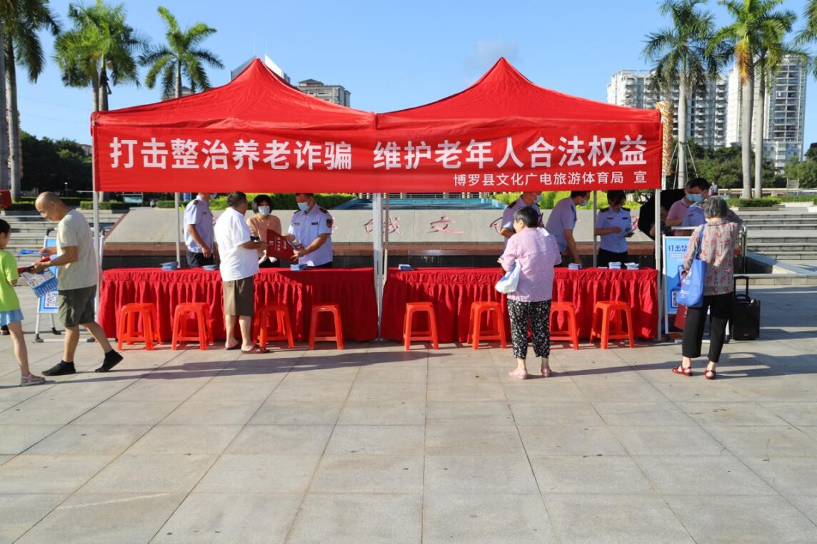 ?。?span lang="zh-CN">月13日早上,博羅縣文化廣電旅游體育局在縣文化廣場舉辦《打擊整治養老詐騙維護老年人合法權益》宣傳活動。我局辦公室、執法大隊、市場管理股(行政審批股)、文化遺產保護和資源開發股的工作人員現場派發宣傳單并向前來咨詢的老年人普及預防養老詐騙知識,告誡老年人要防范不合理的低價旅游、低風險高利潤的藝術品買賣投資等形式的詐騙行為。