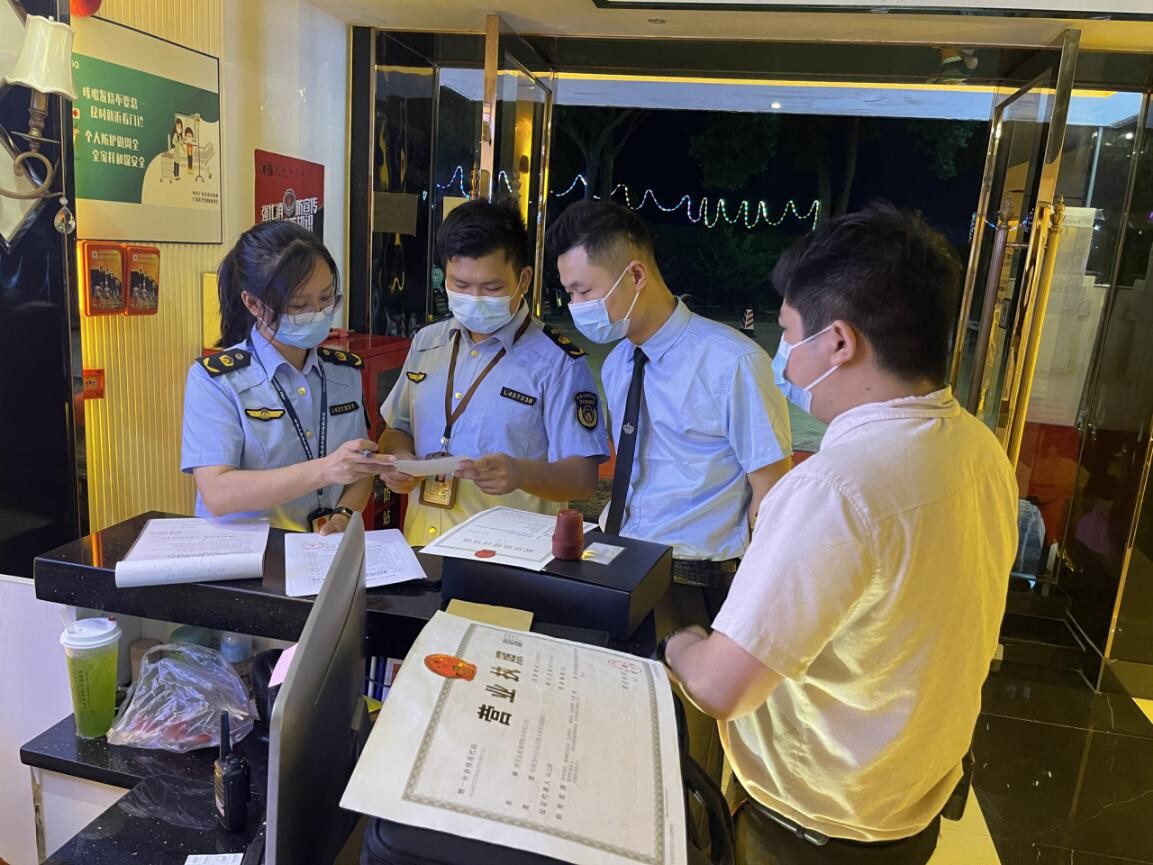 9月20日,市場管理股工作人員前往園洲鎮,對5家ktv、1家游泳池開展文體市場經營秩序檢查。