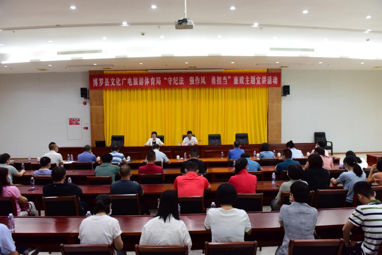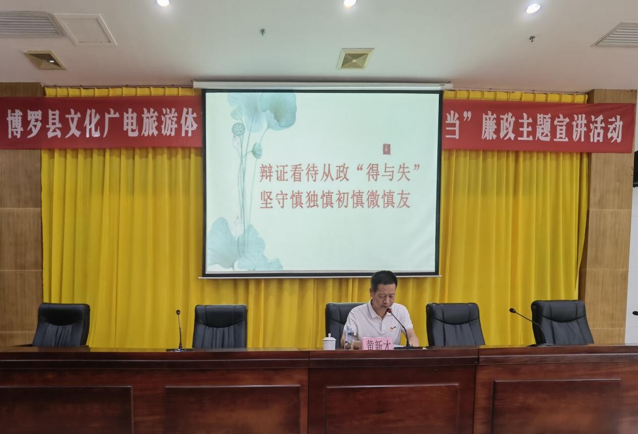 為縱深推進全面從嚴治黨,持續(xù)增強黨組織創(chuàng)造力凝聚力戰(zhàn)斗力,鞏固風清氣正的政治生態(tài),9月30日上午,博羅縣文化廣電旅游體育局開展“守紀法 強作風 勇?lián)敗绷黝}宣講活動,縣紀委監(jiān)委第十派駐紀檢監(jiān)察組組長黃新才以“辯證看待從政‘得與失’堅守慎獨慎初慎微慎友”為主題,為局全體黨員、中層干部講授了一堂內涵豐富、催人警醒的廉政黨課。