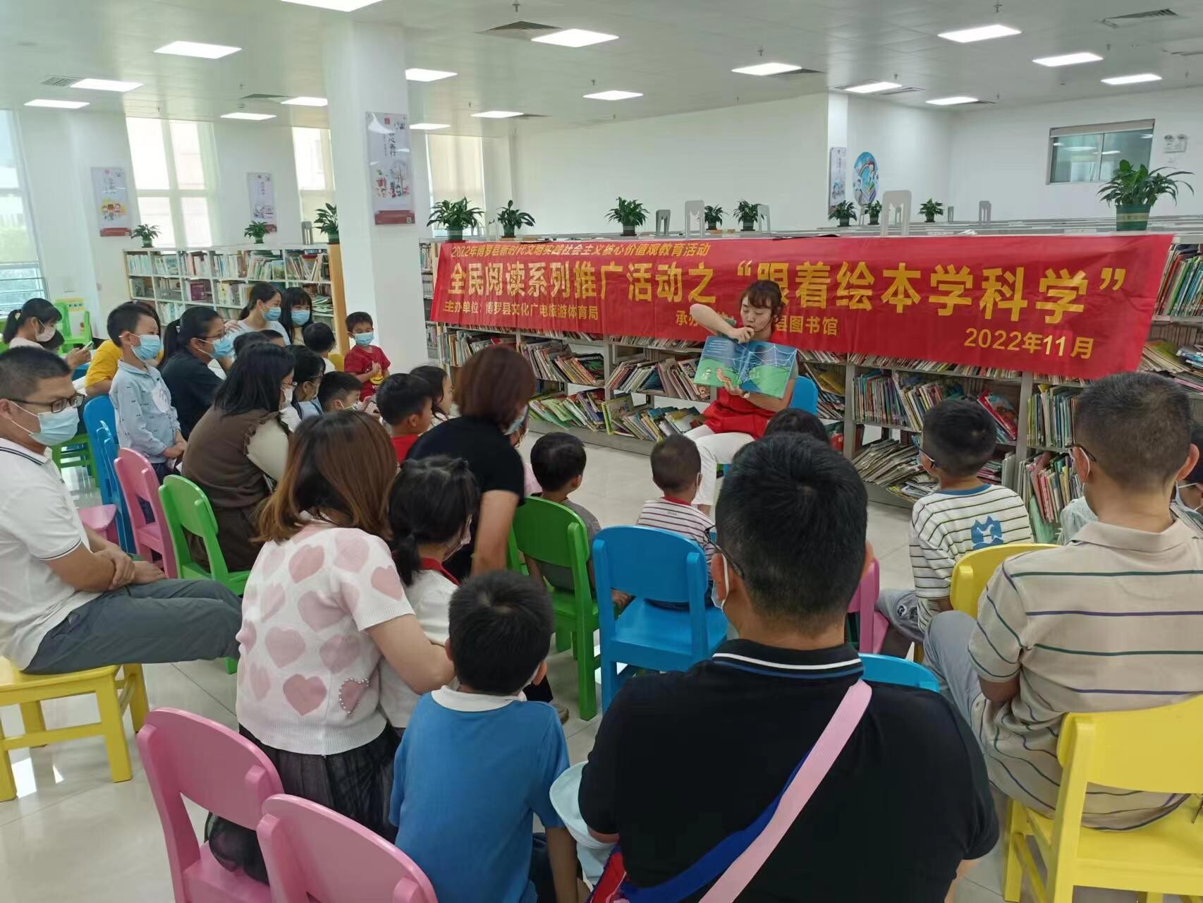 11月13日,縣圖書館在館內少兒室開展全民閱讀推廣之“跟著繪本學科學”親子繪本閱讀活動,35人參加了活動。