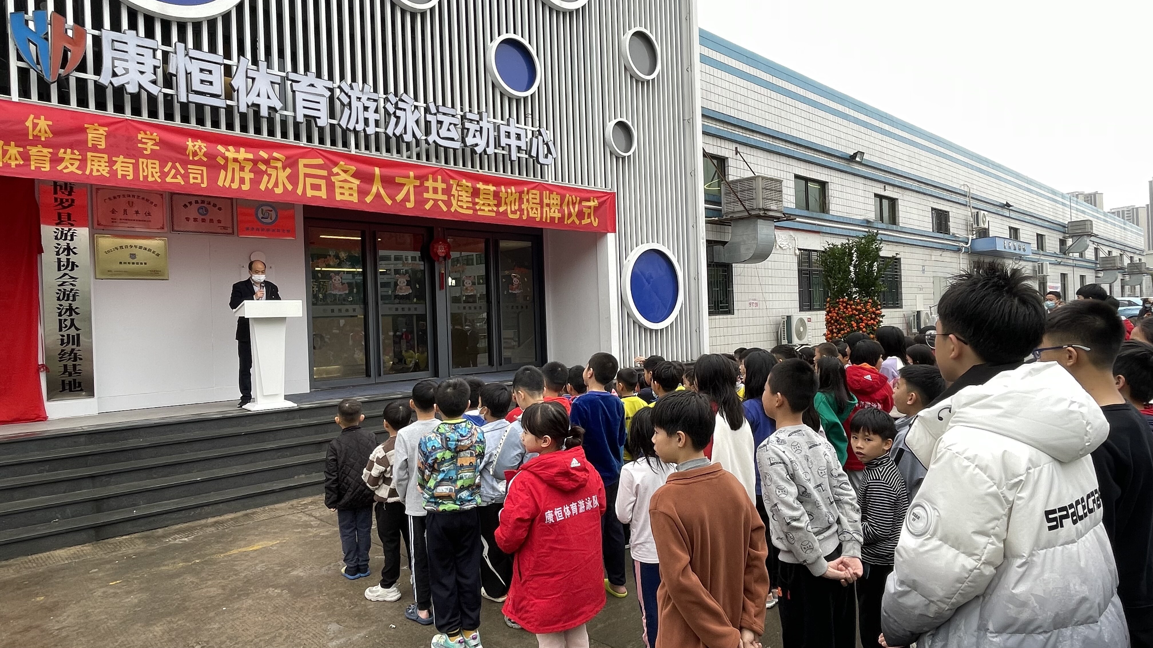 主持揭牌儀式博羅縣文廣旅體局黨組成員、四級調研員鄭浩和參加揭牌儀式的游泳運動員