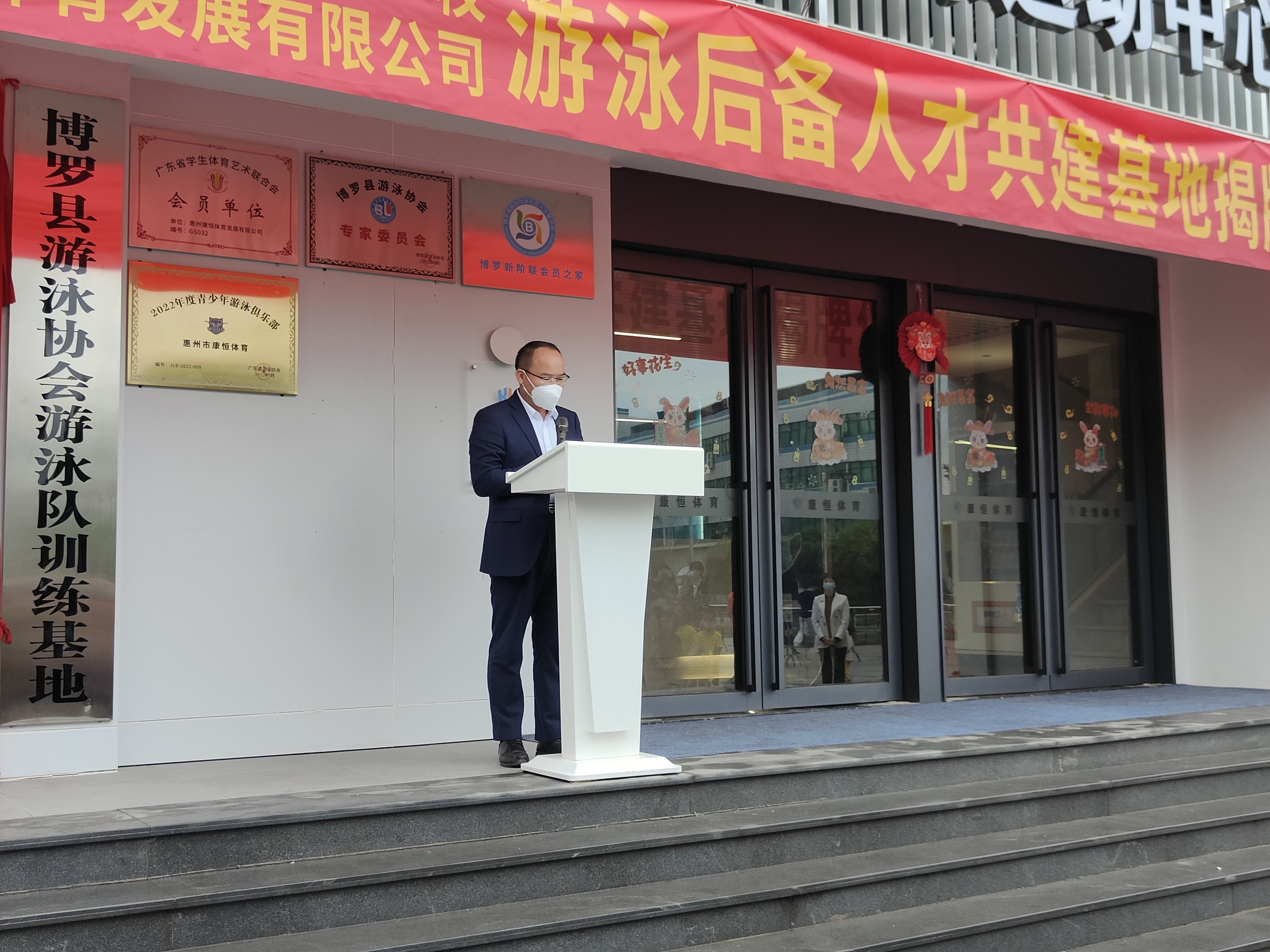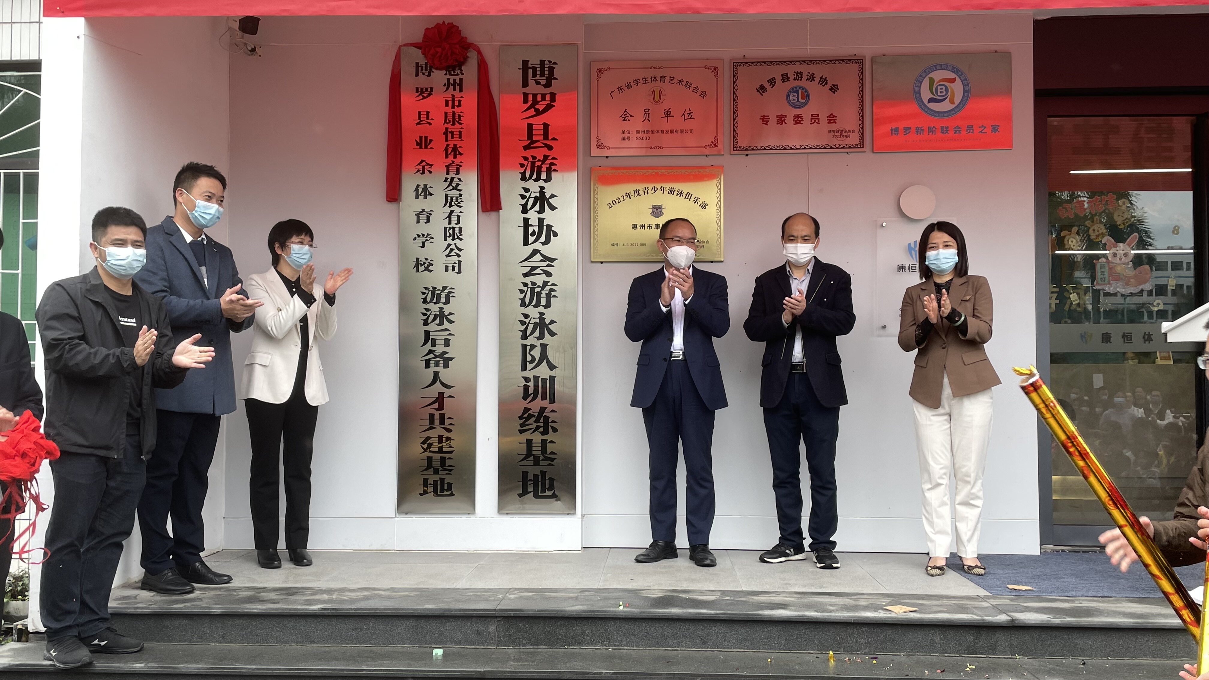 博羅縣委常委、縣委宣傳部部長趙碧波、博羅縣文廣旅體局局長陳雪花、博羅縣文廣旅體局黨組成員、四級調研員鄭浩惠州市康恒體育發展有限公司總經理魏滿強等領導嘉賓共同為游泳后備人才共建基地揭牌