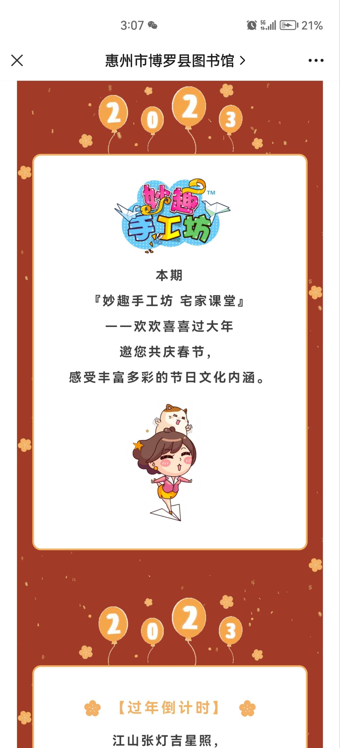 2023年春節期間,博羅縣圖書館舉辦【我們的節日·春節】2023年新春系列活動之線上公益課——《妙趣手工坊?宅家課堂》。