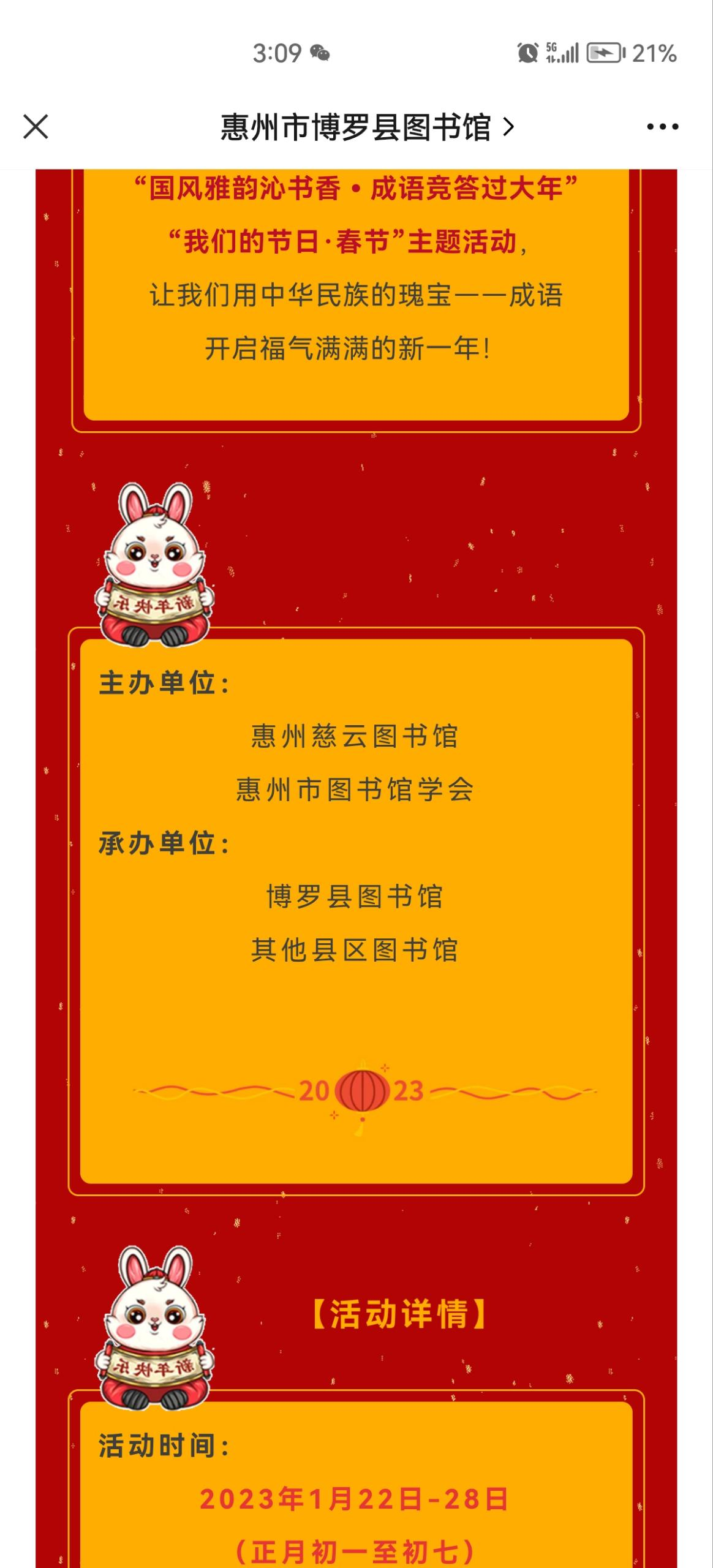 2023年春節期間,博羅縣圖書館舉辦【我們的節日·春節】2023年新春系列活動之“國風雅韻沁書香?成語競答過大年”線上競猜活動。