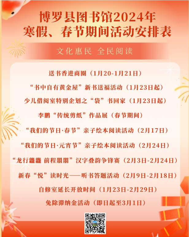 1月16日,博羅縣圖書館在“惠州市博羅縣圖書館”公眾號發布2024年博羅縣圖書館寒假、春節期間活動安排預告。