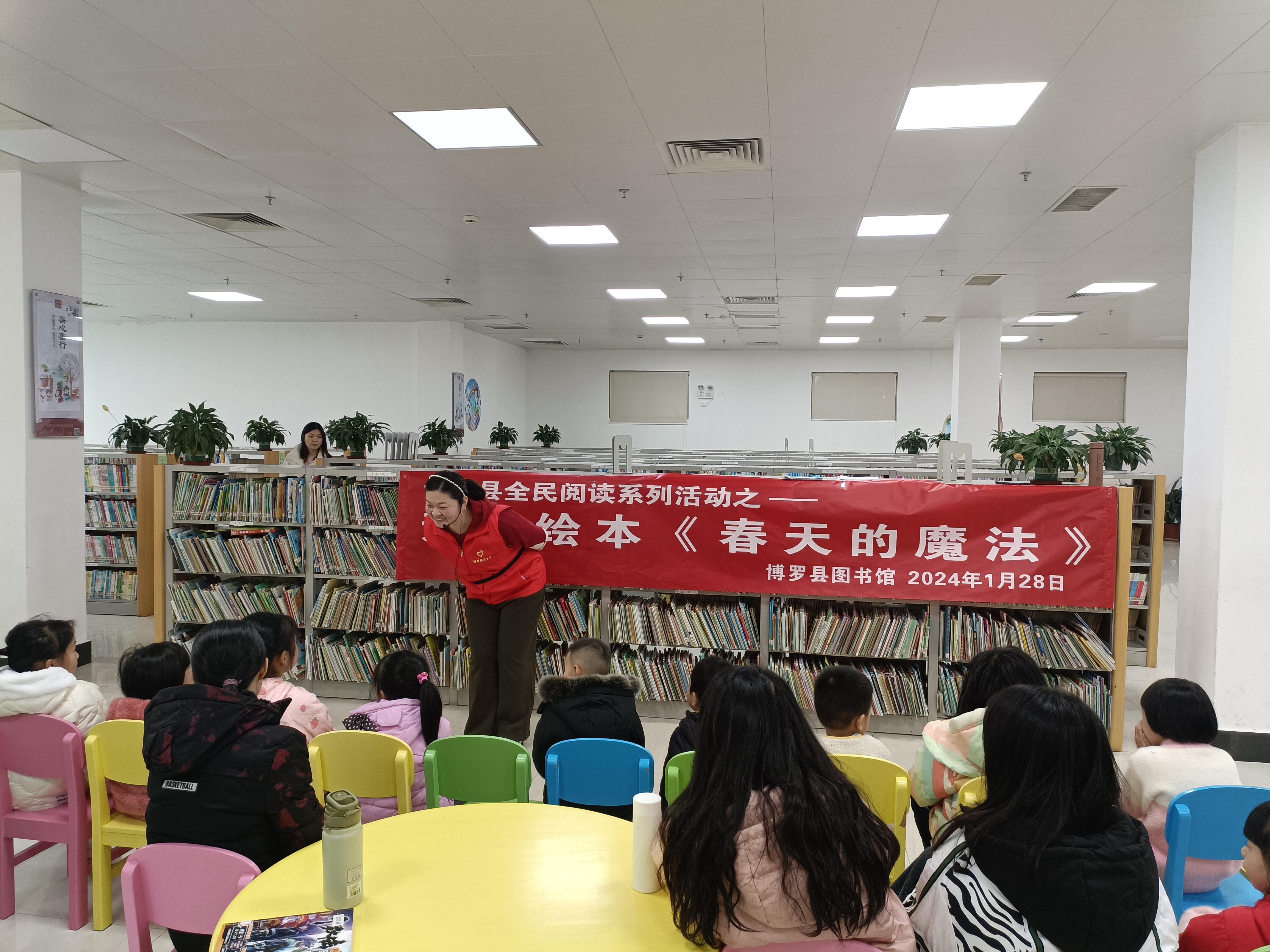 1月28日,在圖書(shū)館一樓少兒閱覽室開(kāi)展全民閱讀系列——親子繪本《春天的魔法》閱讀活動(dòng)。