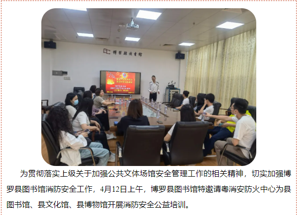 4月12日,博羅縣圖書館特邀請(qǐng)粵消安防火中心為縣圖書館、縣文化館、縣博物館開展消防安全公益培訓(xùn)。