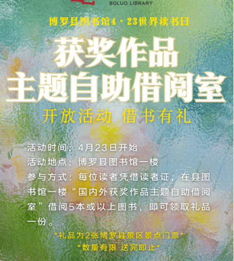 4月23日“世界讀書日”,博羅縣圖書館開展圖書館服務宣傳周活動。線上“讀兩漢簡史·品漢風雅韻”——漢文化知識競答、“閱讀有你,服務有我”留言贈禮、有獎答題競賽活動;線下獲獎作品主題借閱室開放活動。