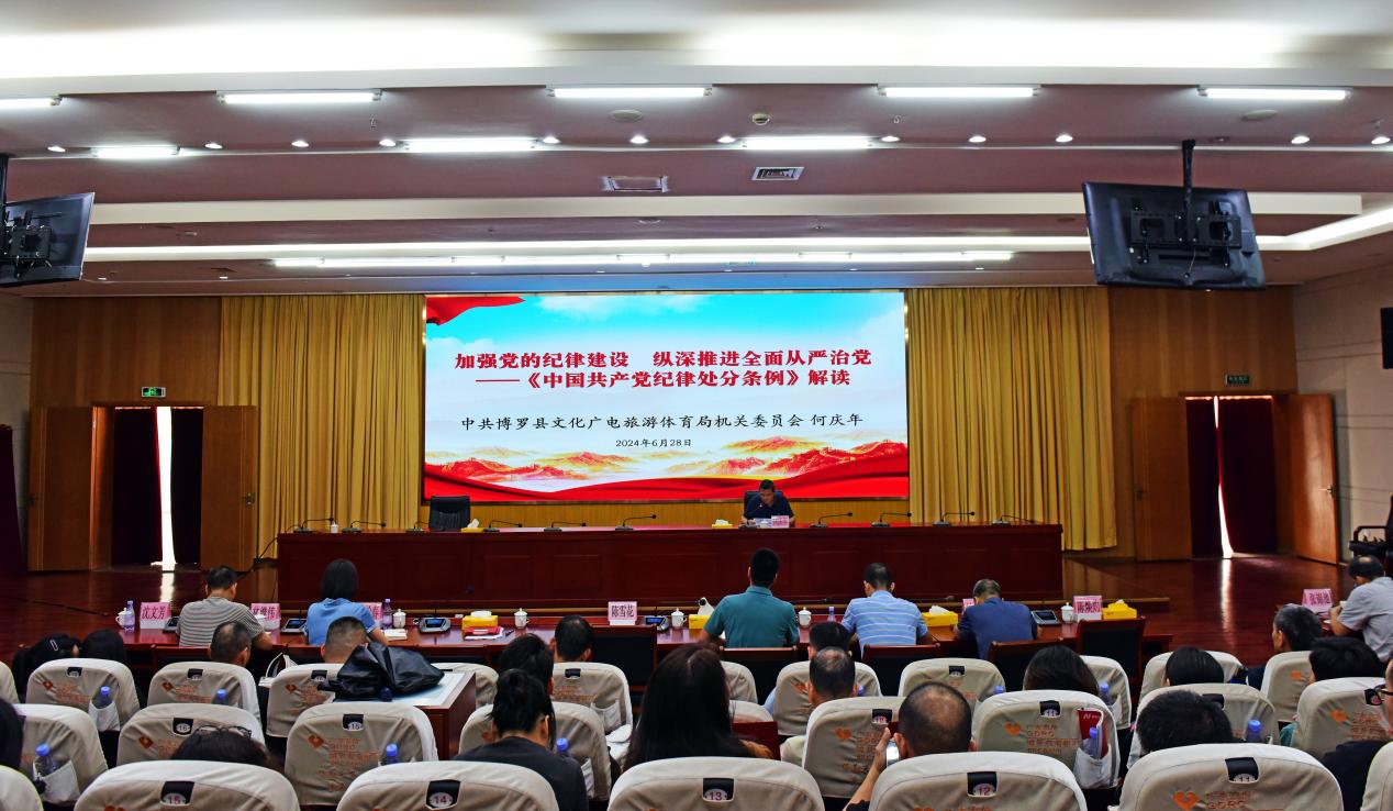 為加強(qiáng)黨的紀(jì)律建設(shè),縱深推進(jìn)全面從嚴(yán)治黨。由縣文化廣電旅游體育局機(jī)關(guān)紀(jì)委書(shū)記、副局長(zhǎng)何慶年給全體黨員干部解讀《中國(guó)共產(chǎn)黨紀(jì)律處分條例》。要求全體黨員打牢思想基礎(chǔ),筑牢思想防線,嚴(yán)守黨的紀(jì)律,不忘初心、牢記使命。