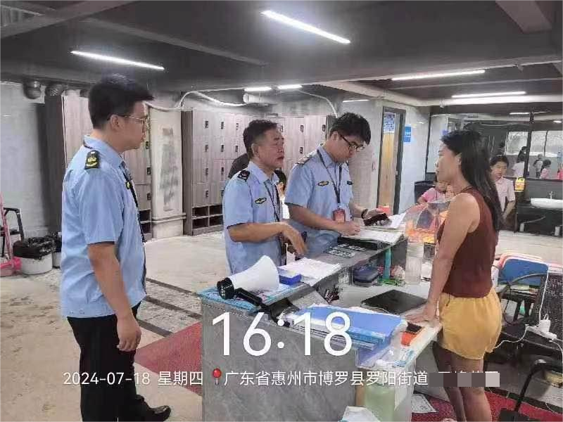 7月15日,執法大隊工作人員前往羅陽街道,核實1宗高危險性體育項目經營活動場所(游泳池)投訴。執法人員檢查發現此場所相關證照不完善,現場責令業主立即停止經營行為。