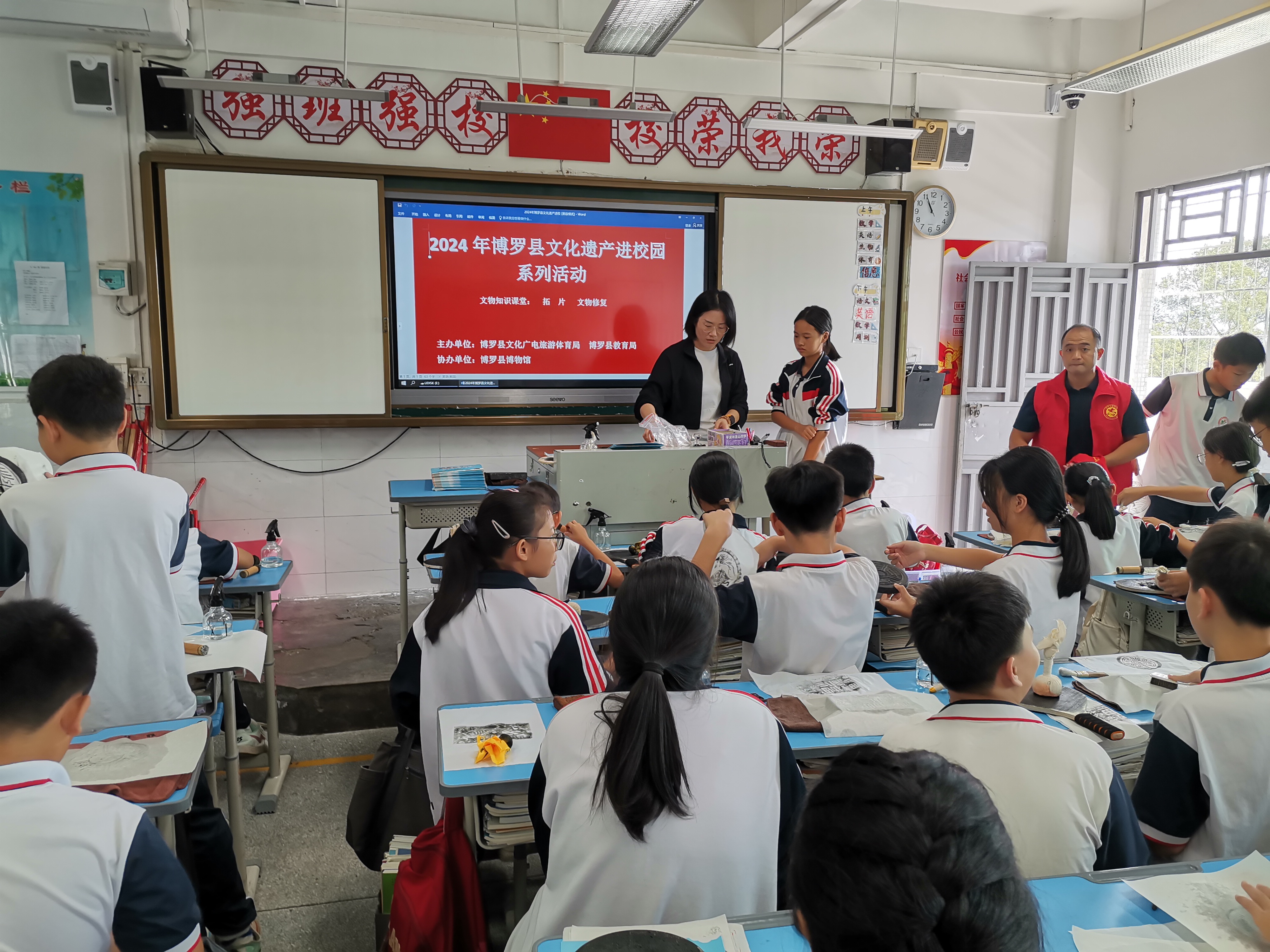 11月7日,局文化遺產保護股會同博物館相關工作人員前往柏塘鎮平安中心小學和湖鎮中學開展“2024年博羅縣文化遺產進校園”系列活動。